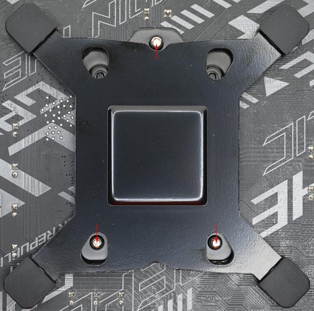▼把背板4支固定柱對準主機板背面散熱器孔位放入。特別注意背板中間凸面朝外,背板