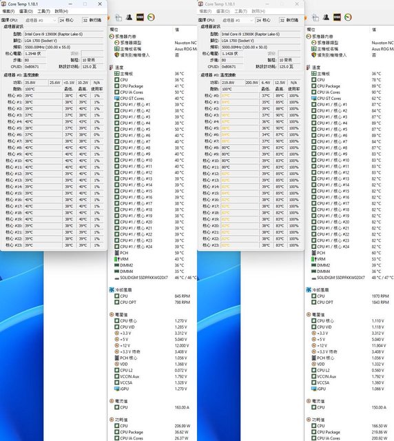 ▼功耗限制220W下待機(左)及高負載(右)的CORE TEMP及AIDA64感測器畫面