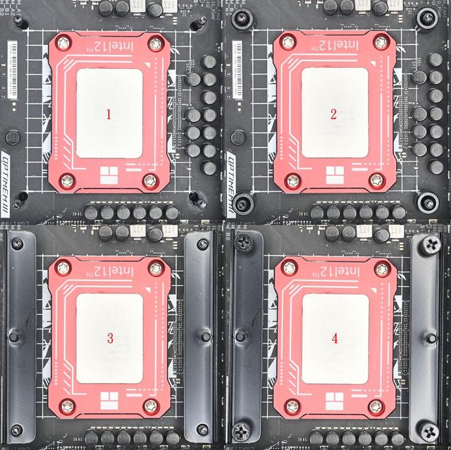 橡膠墊圈那面朝下套入固定柱(2),4個套管都套入固定柱後,放上Intel LGA1700托架(3)
