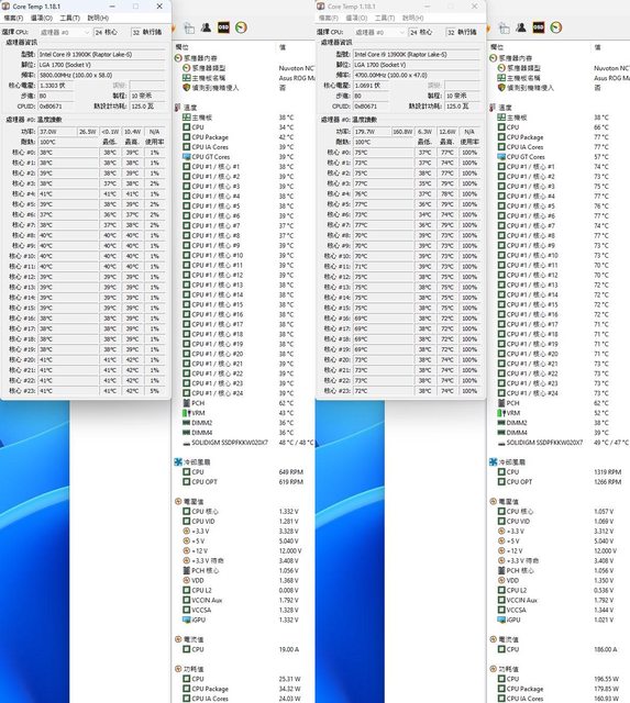 ▼功耗限制180W下待機(左)及高負載(右)的CORE TEMP及AIDA64感測器畫面