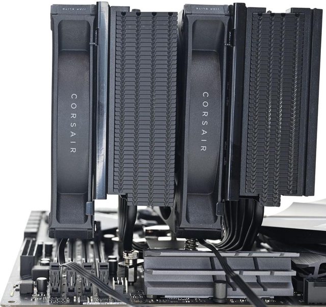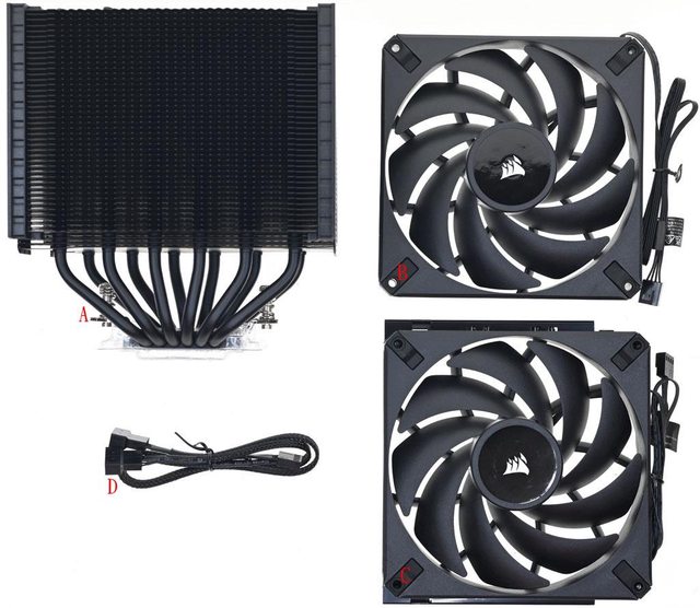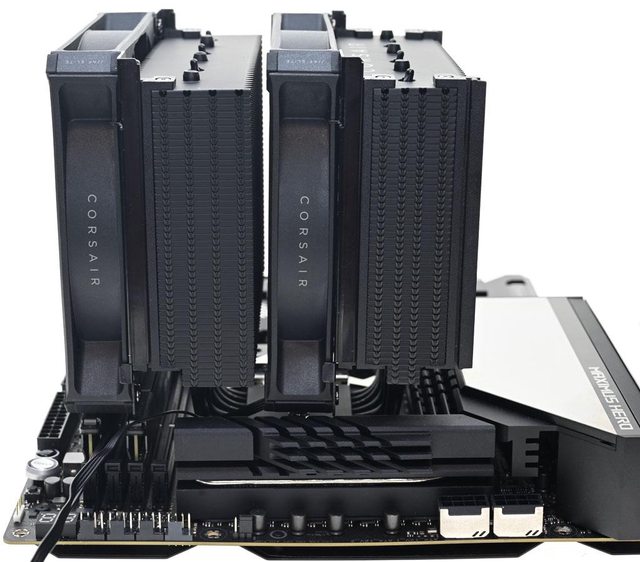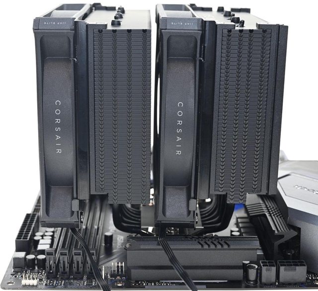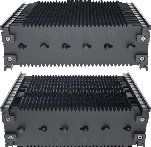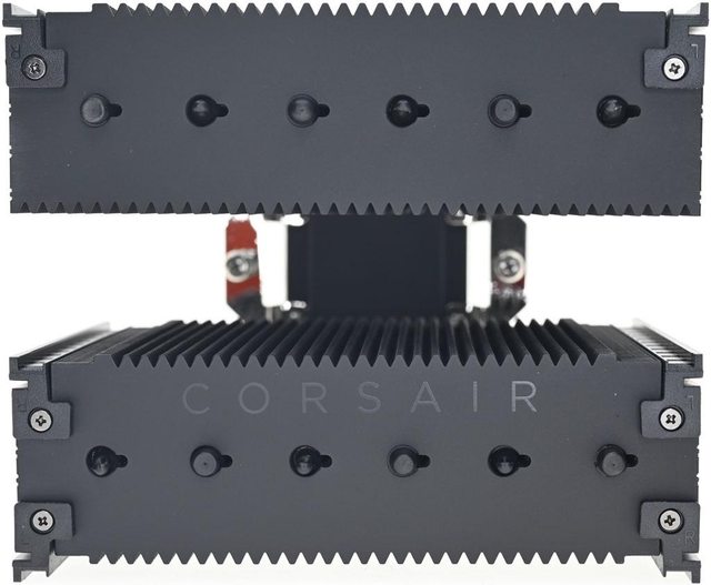 ▼雙塔頂部6支熱導管末端外露,後塔頂部鰭片有CORSAIR字樣