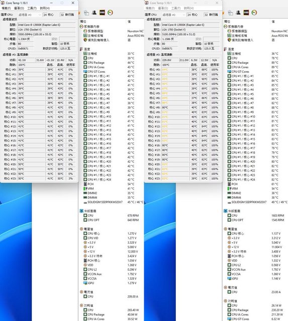 ▼功耗限制230W下待機(左)及高負載(右)的CORE TEMP及AIDA64感測器畫面