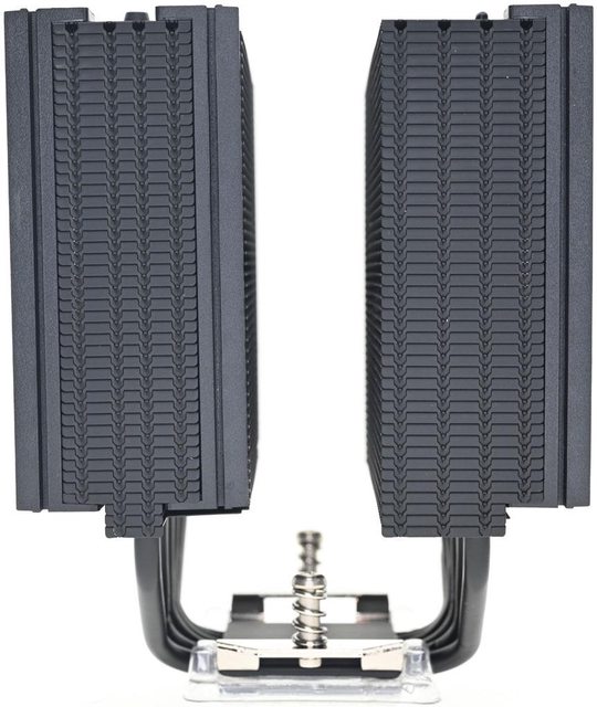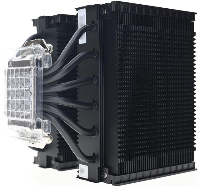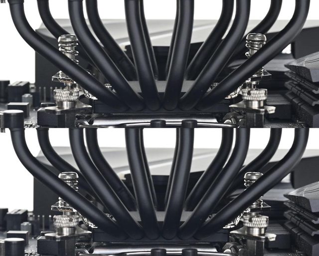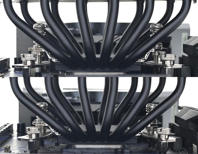 ▼散熱器本體採雙塔設計,底座兩邊各伸出6支直徑6mm熱導管,並在熱導管上安裝45片鰭