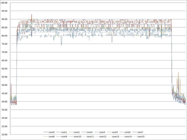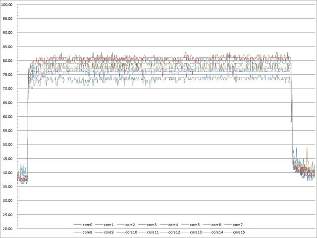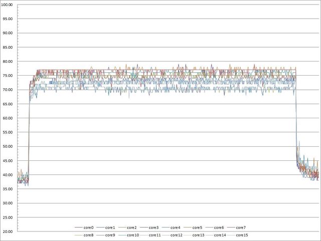 ▼功耗限制230W下高負載30分鐘CORE TEMP溫度記錄圖