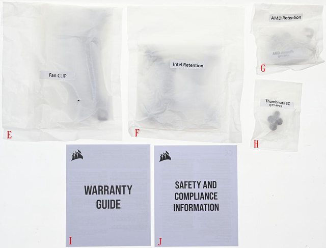 ▼安裝配件裝在個別袋中,分成風扇固定架(E)、Intel配件包(F)、AMD配件包(G)、托架