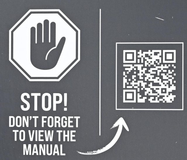 ▼打開外盒,內部側面印上英文"停止!別忘記看說明書"及說明書連結QR碼