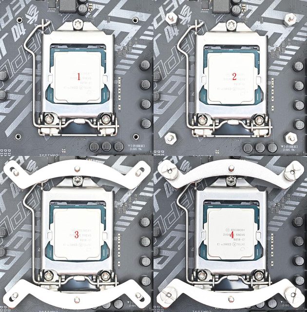▼把背板4支固定鎖點對準主機板背面散熱器孔位放入,特別注意背板2個較深的開口處對