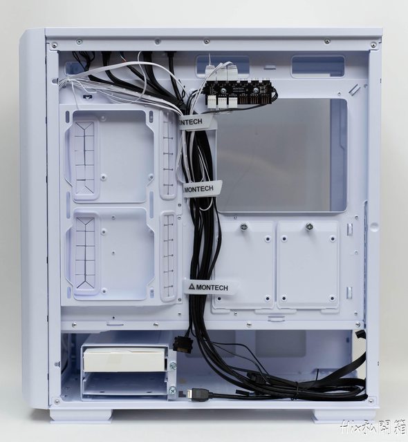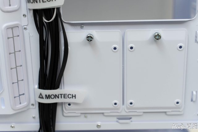 除了整線魔鬼氈束帶外,這邊也可以看到有2個2.5吋硬碟安裝板掛在主板的背面
