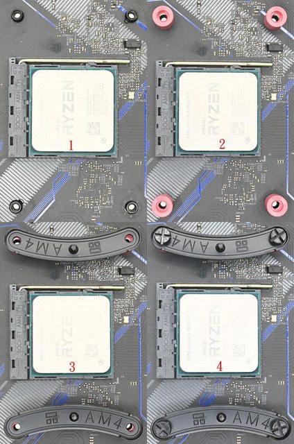 ,將4個紅色AMD套管套進原裝散熱器背板鎖點(2),放上AMD托架(3),對準孔洞插入AMD托