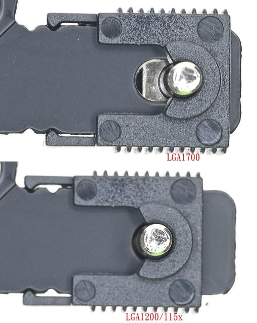 ▼LGA1700托架固定柱外觀為斜線壓花(左),LGA1200/115x托架固定柱外觀為直條紋溝槽(