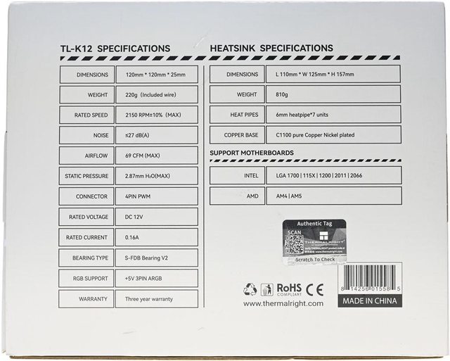 蓋,配置2個S-FDB V2軸承TL-K12風扇。隨附TF7高品質散熱膏及1對2風扇分接線,出示保