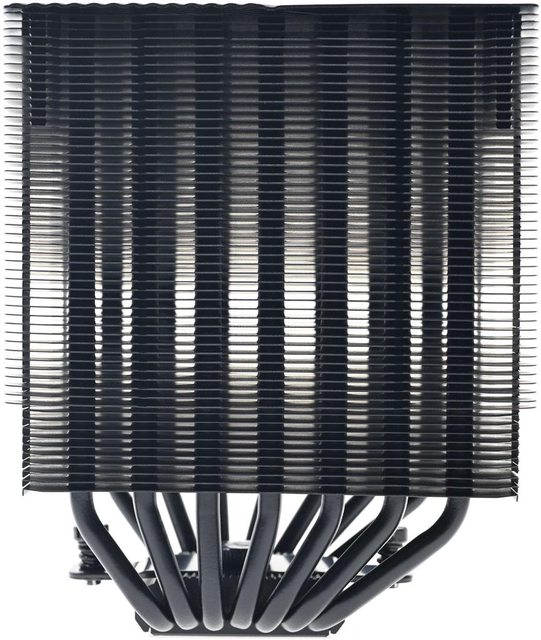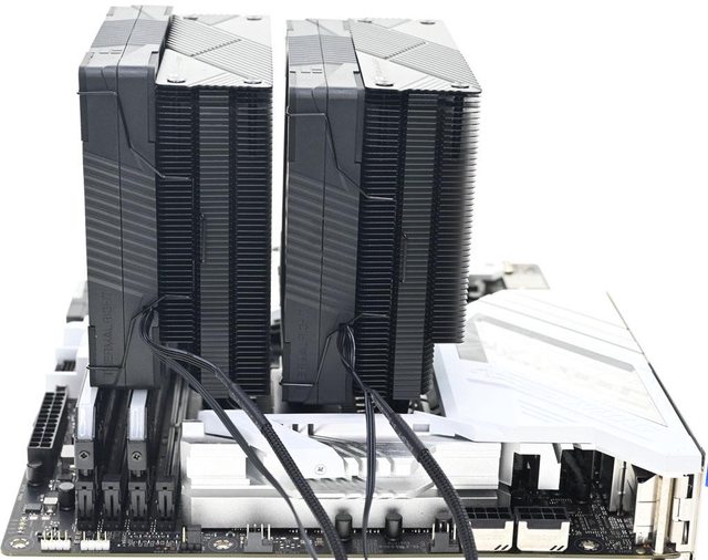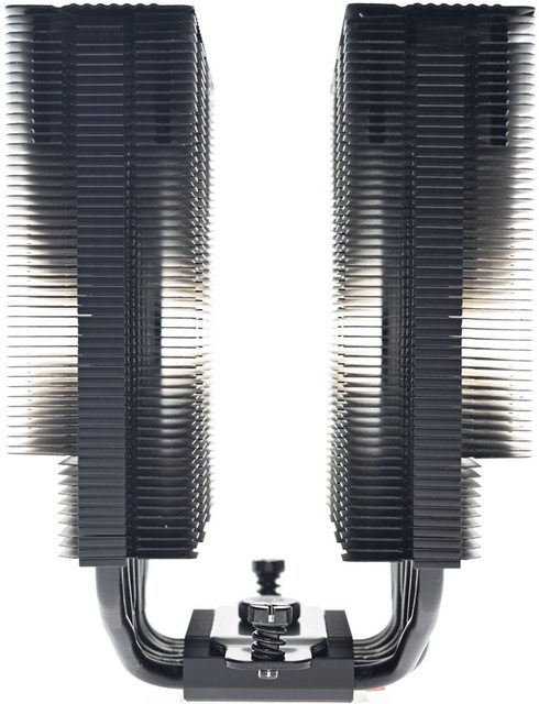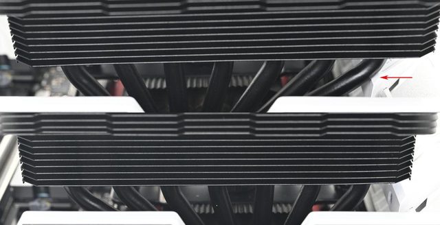 ▼散熱器本體採雙塔設計,黑化處理的熱導管及鰭片往右邊偏置,底座兩邊各伸出7支直