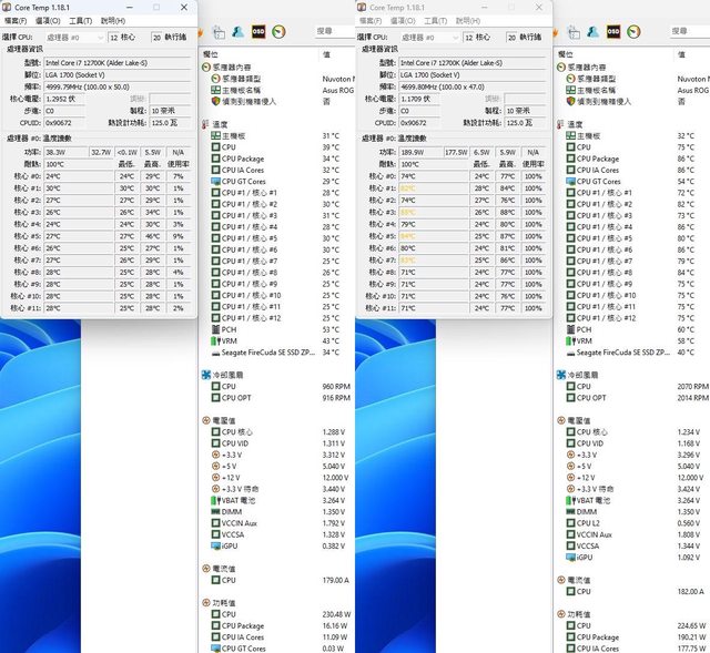 ▼待機(左)及高負載(右)的CORE TEMP及AIDA64感測器畫面