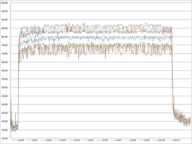 ▼高負載30分鐘CORE TEMP溫度記錄圖