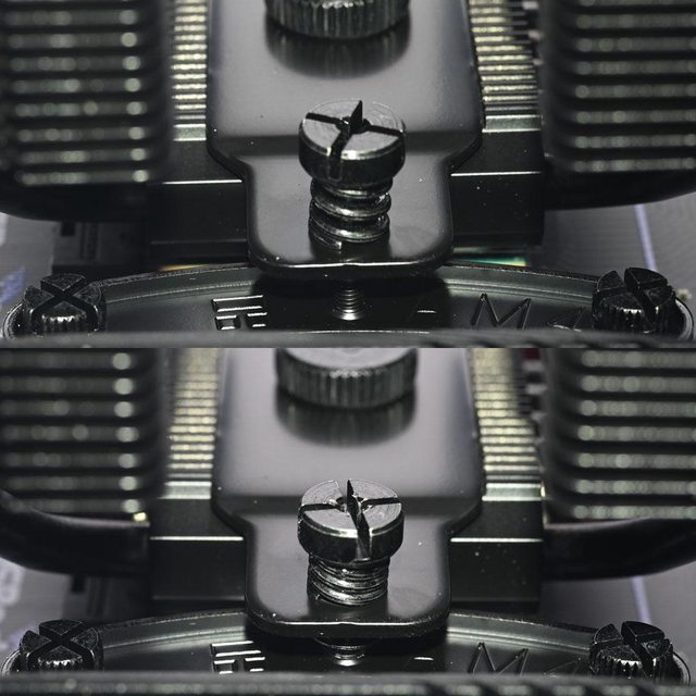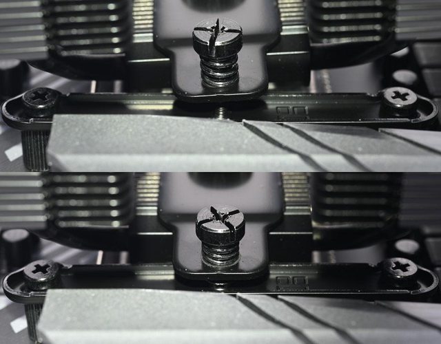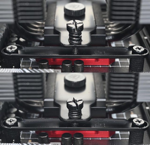 手轉螺絲固定在散熱器底座頂部,壓板兩邊設置彈簧螺帽,用來鎖在托架上並提供接觸下