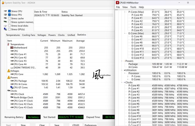 P-core約64~81度,時脈約4589MHz;E-core約64~66度,時脈約3691MHz。