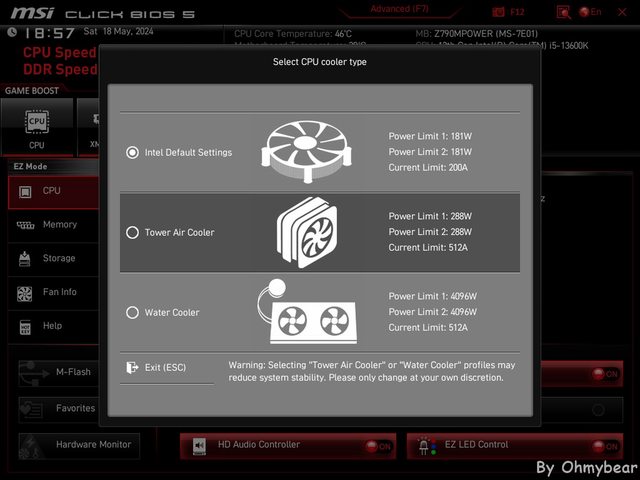 更新完初進入BIOS會詢問目前使用的散熱器等級,不同等級散熱器有不同PL設定。
