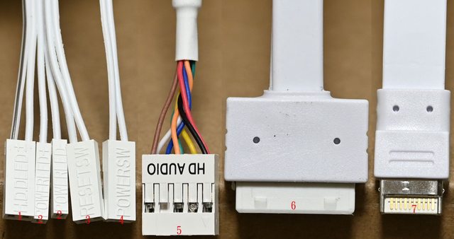 頭,4為電源按鈕接頭,5為耳機麥克風插座接頭,6為USB3.2 Type-A主機板接頭,7為