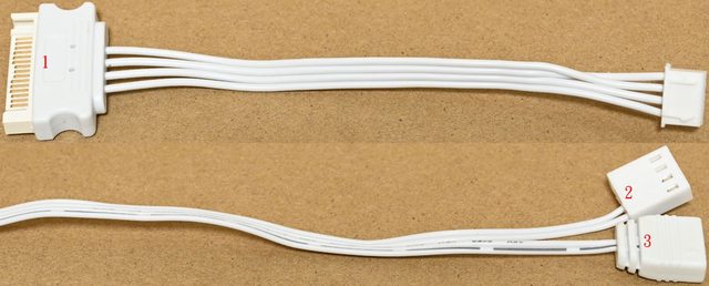 ▼白色燈光風扇控制板線組,SATA電源輸入接頭(1)連接電源供應器,PWM信號同步/轉速