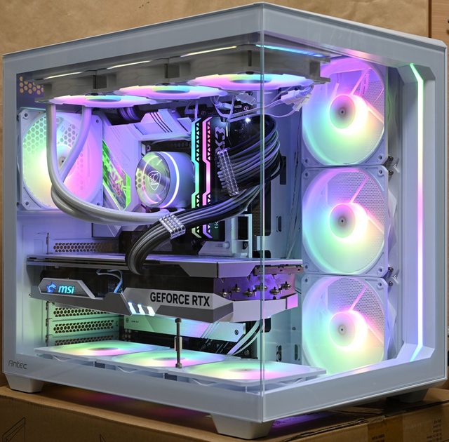 斷層視野讓內部組件一覽無遺。正面邊框配置ARGB燈條,搭配內部發光風扇及其他發光零