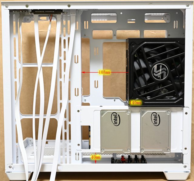 ▼右艙安裝長度140mm的電源供應器時,電源供應器與右側前方風扇架邊緣距離108mm,右