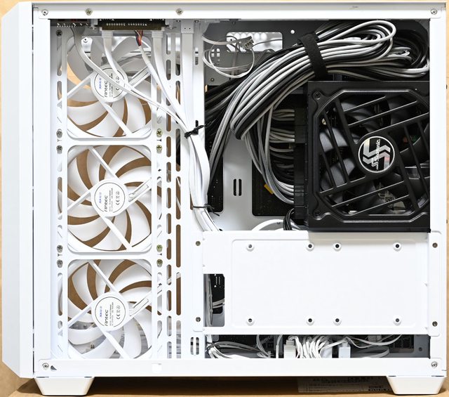 近有整線固定支架。右側前方風扇架長條形固定孔可裝3個120mm風扇,水冷排可裝280mm