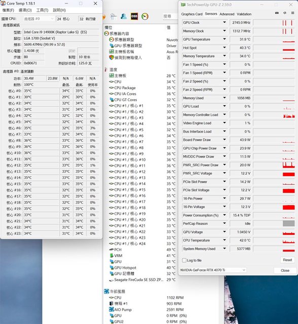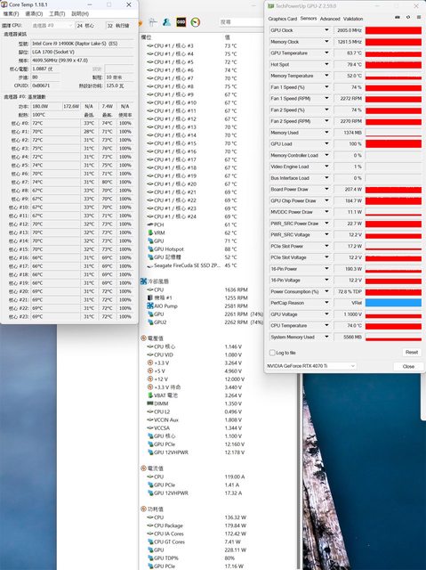 ▼CPU+GPU高負載30分鐘後Core Temp、GPU-Z感測器、AIDA64感測器頁面
