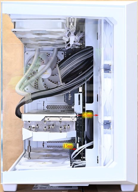 右側前方風扇距離53mm,底部風扇與主機板散熱片距離15mm