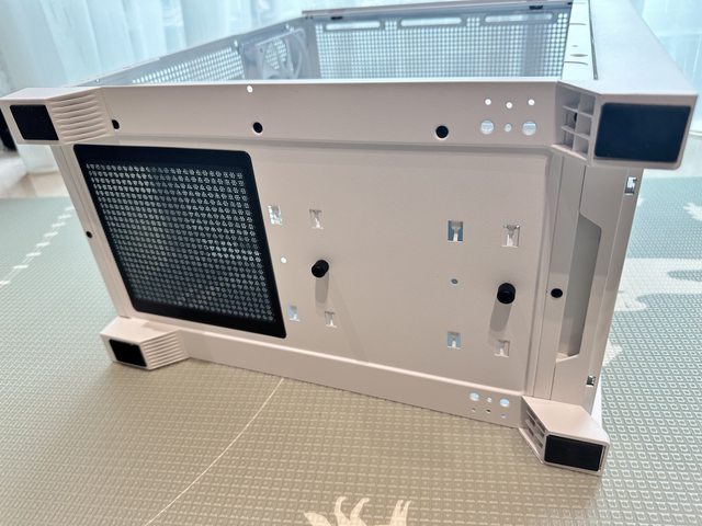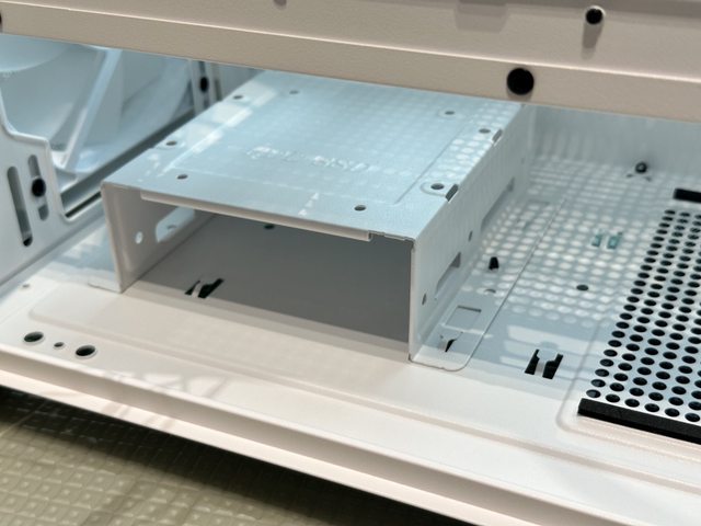 電源進風處的濾網也是磁吸固定,前方可見兩段可調位置的硬碟架。