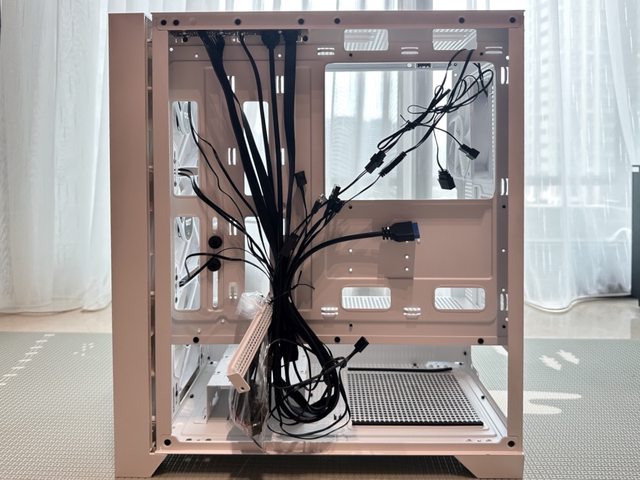 前面板外側右方有提供風扇走線的開孔,但出廠時預設從內部走線,個人建議勞動一下把