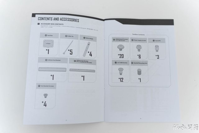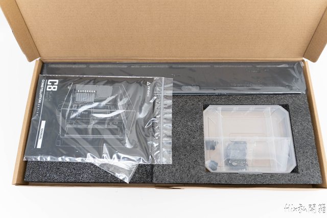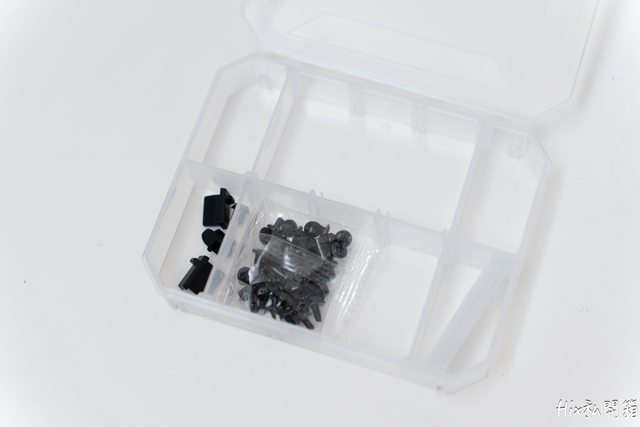 配件盒內放著下置風扇的12cm風扇支架、螺絲盒、束帶及說明書