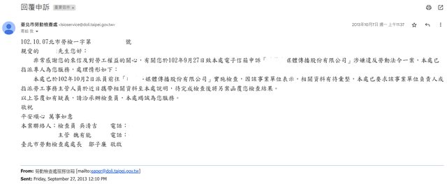最早具名檢舉時台北市勞工局分案很快 一星期多就回信通知我受理