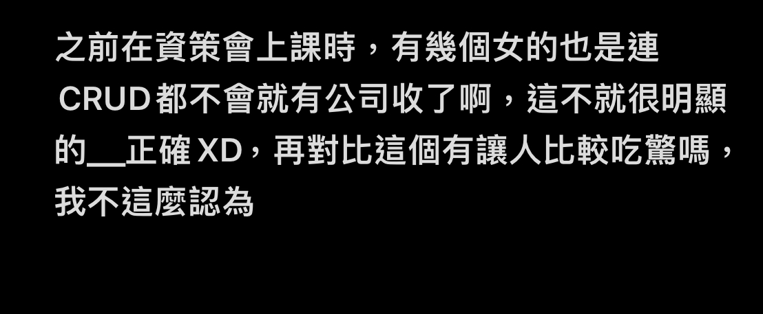 推 sssyoyo: 軟體業性別女自學或去培訓班過個水,只要不是太離譜或反01/11 23:04
