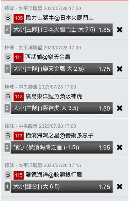 105火腿2.5大1.85 111 樂天2.5大1.75 112 阪神3.5大1.8 113 星星讓分1.95 115 羅德/軟銀6.5大1.75 供刪 -- ※ 發信站: 批踢踢實業坊(web-ptt.tw), 來自: 39.12.81.166 (臺灣) ※ 文章網址: https://web-ptt.tw/SportLottery/M.1690534569.A.8CE