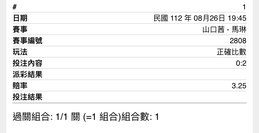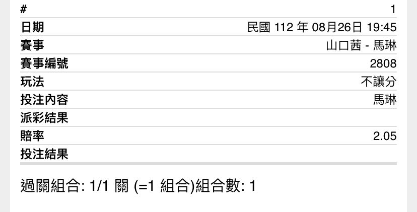 推 qiren: 馬琳2:0串安洗2:1,10倍券1000 101.9.132.113 08/26 18:51