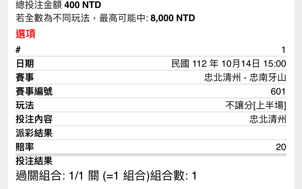 → hatsuta: 第一次玩單場全部下注都中獎 122.118.57.51 10/14 17:13