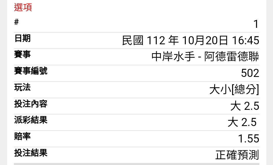 噓 Taiwan007: 剛開始上半1.5小有1.50真的很甜,可惜 223.138.20.49 10/20 17:13