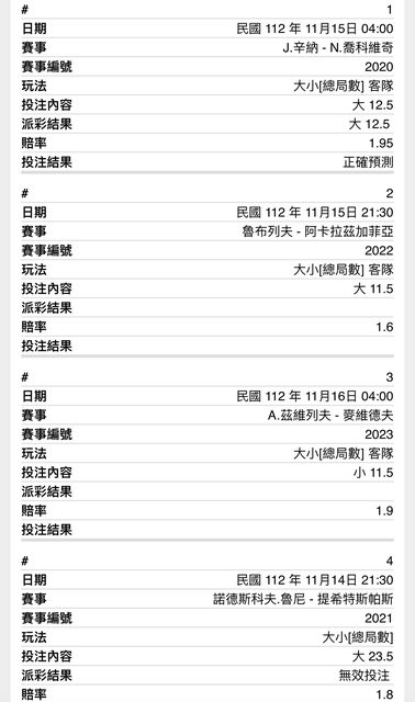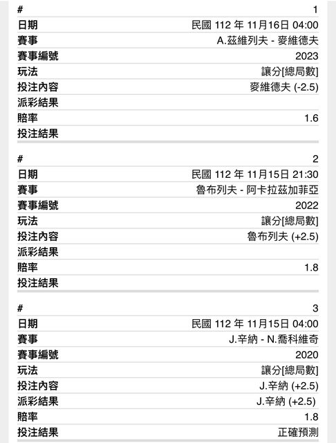 昨天依照大小、不讓、讓分、正比個別下單