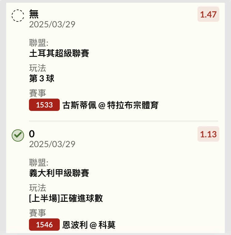 推 JAY2005jay: 賽前買了上半1.5大 2.15111.250.201.174 03/29 21:40