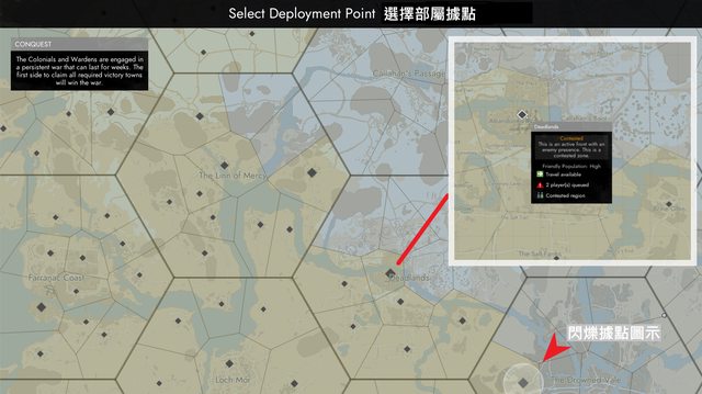 : : 建議選擇 閃爍據點圖示 或是 友軍人數多/ Friendly Population - High 的據點;