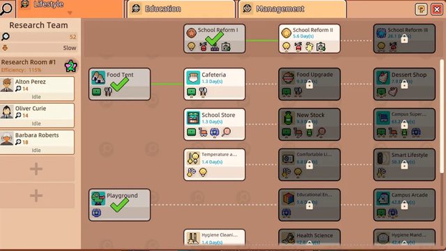 所以玩家要不斷的培養更好的教師,開發更好的課程跟設施來持續吸引學生。