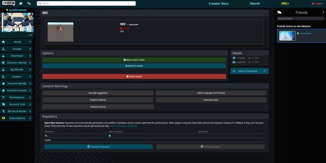VRchat網頁中可以看到人物上傳成功