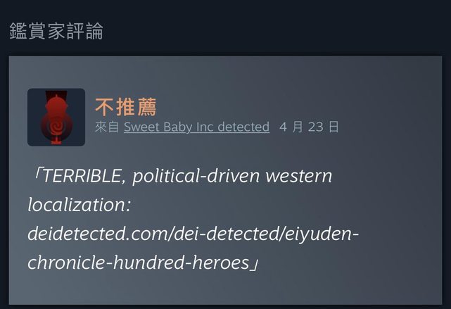 如圖 剛剛看到這款遊戲被鑑賞家sweet baby inc detected偵測到 好像有被政確介入? 翻了一下其他版好像有看到文本翻譯魔改的樣子 為了遊戲產業的未來 這款是不是該pass了? -- ※ 發信站: 批踢踢實業坊(web-ptt.tw), 來自: 49.216.161.77 (臺灣) ※ 文章網址: https://web-ptt.tw/Steam/M.1713920056.A.74C
