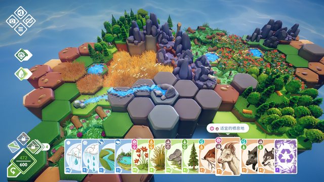 綠化環境遊戲。先用雨水將荒地變成綠地,再種上各種植物作為棲地,最後放入對應的動