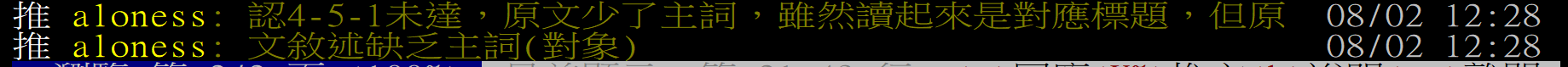 → BlueBird5566: 但是這篇被水桶的推文 有很多都沒主詞也判4-5-1 08/12 17:00