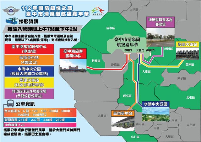 5.交通資訊:本次活動不開放一般車輛入營,請民眾至各接駁站轉乘免費接駁車往返。