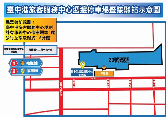 (4)臺中港旅客服務中心停車場:計411個汽車停車位,步行至接駁站約1分鐘。