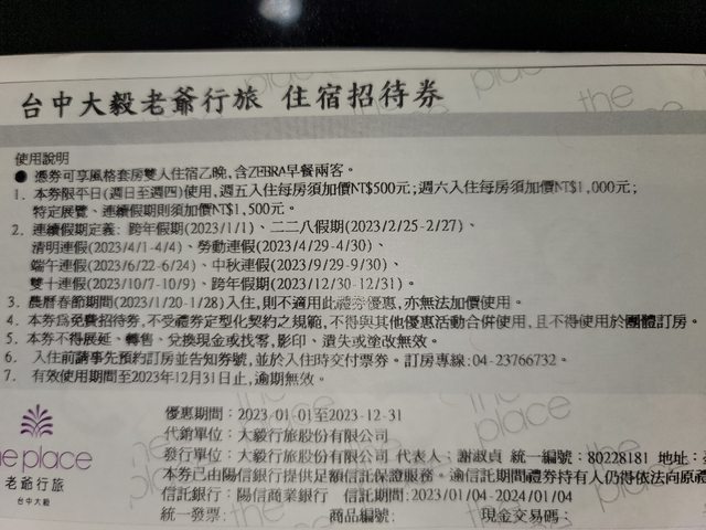 物件:台中大毅老爺行旅住宿券一張