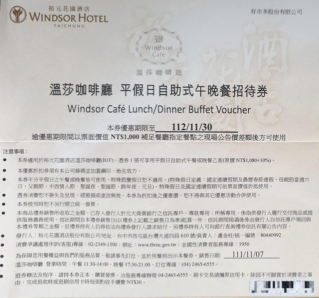 標題[交易] 裕元花園酒店 溫莎咖啡廳 午餐券 晚餐券