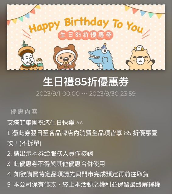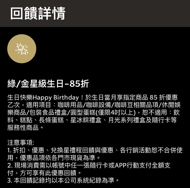 物品名稱:星巴克會員生日85折